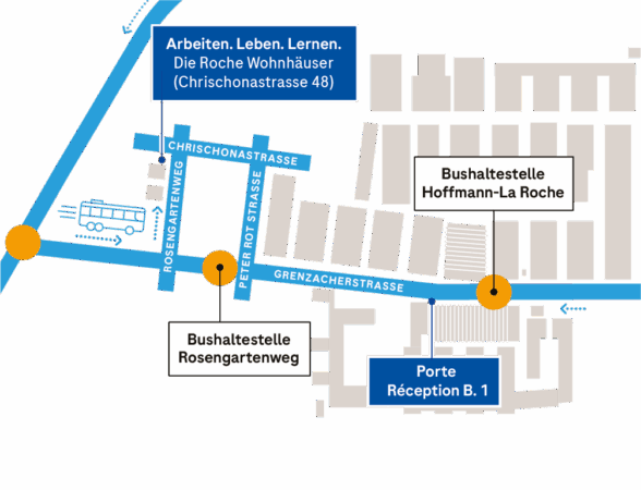 Die Wohnhäuser von Roche befinden sich in unmittelbarer Nähe zum Firmenareal in Basel. Für Lernende, die am Standort Kaiseraugst arbeiten, steht ein kostenloser Shuttlebus zur Verfügung. Die Fahrzeit beträgt zwischen 15 und 20 Minuten.